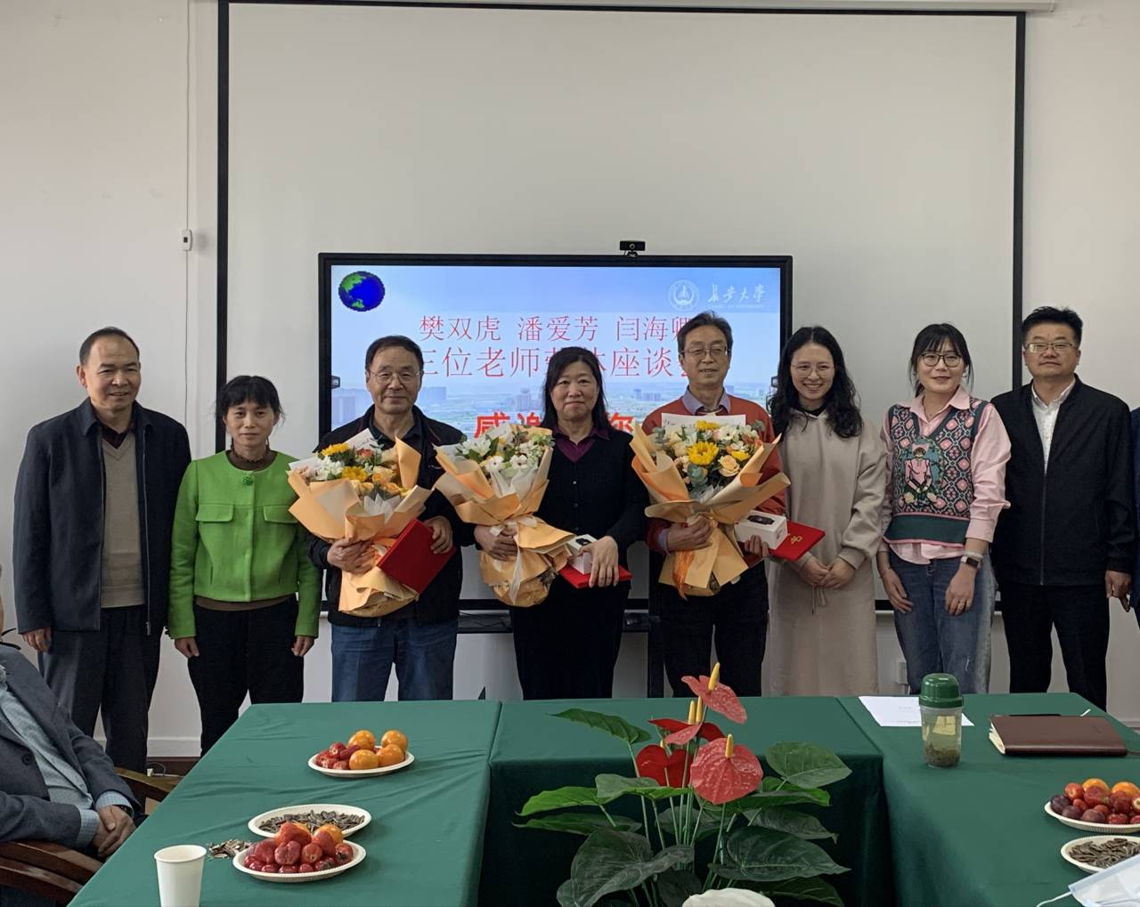 座谈伊始,主持人凤永刚介绍了三位老师的工作经历及其教学和科研成果。学院领导向三位老师颁发了“光荣退休”荣誉证书,赠送了纪念品,教师代表和学生代表向三位老师赠送了鲜花。