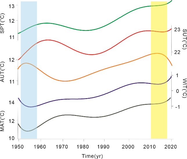 植物的生长对季节性温度的响应十分敏感(Miller et al.,2010;Birks et al.,2010; Shakun, 2018),本研究以植物遗存—木炭作为代用指标探讨了东亚地区全新世中期(6.55-3.45 cal Ka BP)季节性的温度变化。重建结果表明关中地区全新世中期以来四季温度存在显著波动,季节性温度和年均温度均在5.55-5.35cal ka BP之间存在暖高峰,其中冬季温度的变化趋势与年均温的变化高度吻合(图1)。近70年年均和四季的温度变化趋势(图2)也显示冬季温度的变化与年均温变化同步。全新世中期以后冬季日照辐射的显著增加(Laskar等人,2011;Pang等人,2020),可能是全新世中期以来冬季温度变化对年均温的贡献率增加的主要因素。该工作为解疑“全新世温度谜题”提供了重要参考。
