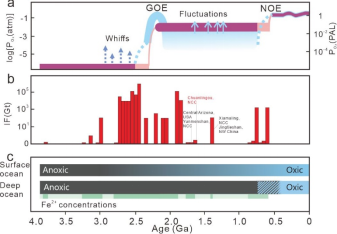 图1. 地质历史时期海洋大气环境演化与铁建造分布示意图