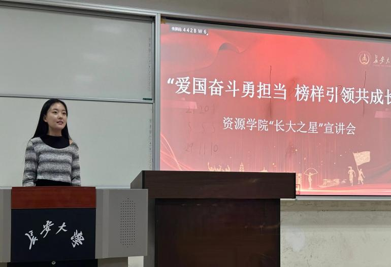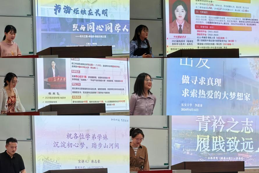 在宣讲环节,奉献之星杜燕飞分享其成长经历,她在学习与科研方面发挥自身优势,帮助班级建设,主动担当,讲好长大故事;宿舍文明之星黄欣瑶所在宿舍集体生活习惯良好,宿舍关系融洽,积极沟通,共同成长;班级引领之星蒋志豪分享了个人经历与班级建设经验,他始终扎实求学,注重班级建设,发挥引领作用,指出集体的荣誉离不开每个人的努力;领航之星周文洁讲解了 “因矿而立,为矿而育”,引出学院的发展脉络及地质专业特色,希望大家能以饱满的热情投入到地质学习中来;求真之星、领航之星李晨菲作为一名外语学子,从听说读写四个方面向大家分享了英语学习方法,希望同学们能够有所进益;长大之星(个人)、双创之星洪灏琪从日常规划、学习方法,科研竞赛和生活建议四个方面向大家分享自己的经验,建议大家多尝试接触科研工作,参加课外活动,丰富大学生活。