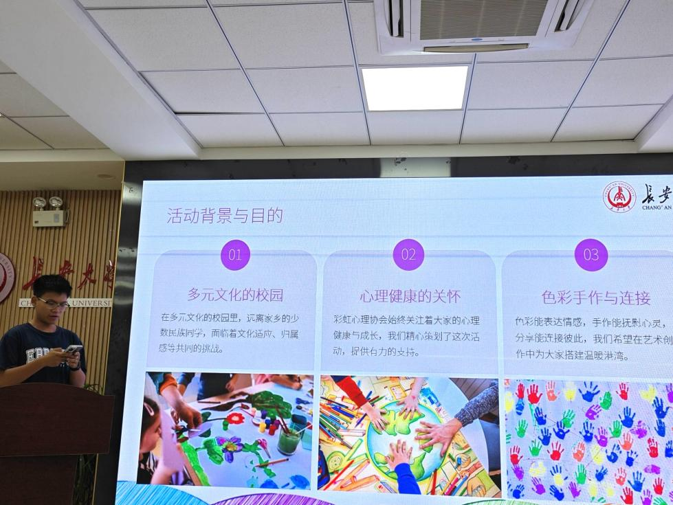 主持人赵家铭通过主题讲解介绍了活动的背景与意义。他表示,在多元文化的校园环境中,部分远离家乡的少数民族同学可能面临文化适应与归属感的挑战,而艺术创作能够成为情感表达的桥梁,帮助同学们更好地融入集体、释放压力。