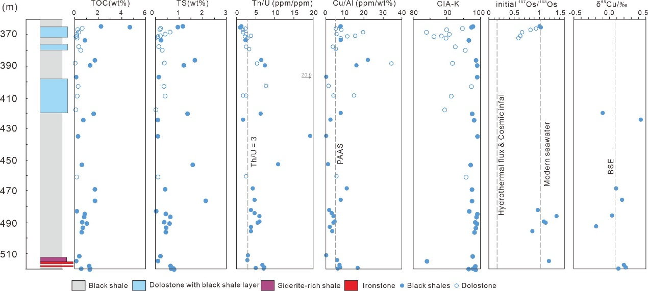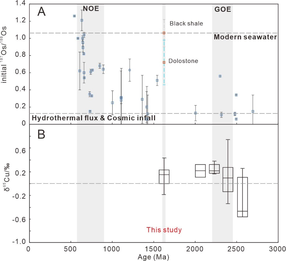 -锇(187Re-187Os体系不仅是一种用途广泛的精密计时器,还可以有效地示踪沉积古环境。在氧化的大气圈,ReReO4-形式被搬运进入海洋,187Re通过β-衰变逐渐转变为稳定同位素187Os,这一衰变过程具有稳定的半衰期(约41.6×1010年)。海水187Os/188Os组成反应了放射成因Os和非放射成因Os输入状态,例如现代海洋187Os/188Os比值约为1.06,这是由于陆表径流带来了大量氧化风化来源的放射成因Os。而来自宇宙尘埃和海底热液Os同位素具有非放射成因特征,187Os/188Os约为0.13。因此,海水187Os/188Os可以示踪地球表层氧化还原环境演化。近年来,铜同位素也用于研究地球表生环境演化过程,例如前人研究表明,氧化风化大陆硫化物(例如黄铜矿和辉铜矿)将会通过陆表径流向海洋输送重铜(65Cu)同位素。我国华北克拉通16.4亿年串岭沟组发育有地球平静期最古老、保存最好的黑色页岩。鉴于此,草榴社区 杨秀清教授、中国地质科学院矿产资源研究所毛景文院士及其国内外合作者对我国华北克拉通串岭沟组中黑色页岩和白云岩开展了元素、Re-OsCu同位素组成研究,取得了如下重要认识: