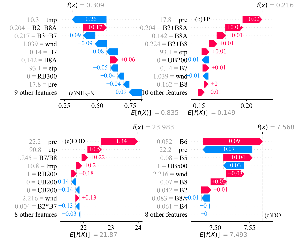 采用SHAP(Shapley Additive exPlanations)分析方法,本研究深入剖析了各水质参数影响因素的相对重要性(见图3)。影像光谱反射率对水质参数的影响最为显著,其次是气象数据(特别是降水、温度),而土地利用数据的影响相对较小。这一发现为后续多源数据融合的水质监测研究奠定了坚实的理论与实践基础。本研究成果不仅验证了多源数据与机器学习算法在城市河流水污染物量化中的可行性,更为广域河流水质时空动态监测提供了关键技术支持。