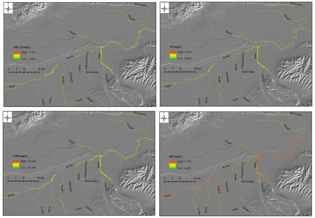 模型精度评估采用四参数体系,图2展示了最优模型在测试与验证数据集上的拟合散点图。随着多源数据的整合,NH3-N、TP、DO及COD预测模型展现出稳定性,分别在300米、200米、500米及200米的缓冲区范围内达到最高精度。基于最优模型得到四种水质参数的空间分布图(图4),展示了氨氮、总磷、化学需氧量和溶解氧的高低值分布,再结合国家地表水质量监测标准,进行单一和综合的水质状况分析。