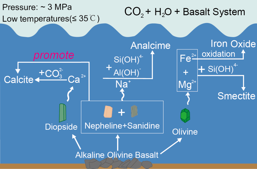 本论文采集了中国主要陆相玄武岩储层中的9件、4种类型的玄武岩样品,并对其进行了一系列水岩反应的实验室研究(见图)。实验结果表明,在较低(≤35℃)的温度条件下,CO2-H2O-玄武岩及CO2-卤水-玄武岩体系中形成的次生碳酸盐矿物,主要以方解石(CaCO3)为主,而非MgCO3FeCO3。因此,在低温(≤35℃)条件下,相较于富含Mg、Fe的玄武岩,含Ca较高的玄武岩更有利于形成稳定的碳酸盐矿物。此外,在低温(≤35℃)和约3 MPa压力的实验条件下,与其他类型的玄武岩相比,富含钙矿物及典型碱性矿物(霞石和Na-透长石)的碱性橄榄玄武岩,其反应后溶液中的pH值最高,且反应产物中具有最高的方解石含量。因此,在低温(≤35℃)条件下,碱性矿物霞石及Na-透长石作为反应溶液中的pH缓冲剂,增加了CO2-H2O-玄武岩反应体系的pH值,并促进了方解石的沉淀。此外,研究结果表明在相同的实验条件下,来自山东临朐-昌乐火山盆地的新生代碱性橄榄玄武岩具有最高的碳矿化速率。因此,山东临朐-昌乐火山盆地可作为中国原位(in-situ)碳封存最有前景的玄武岩储层之一。对于非原位(ex-situ)的海洋碳封存,与目前大量使用的橄榄石相比,透辉石或Ca-长石可能更适合撒播到海洋中来实现海洋负排放。
