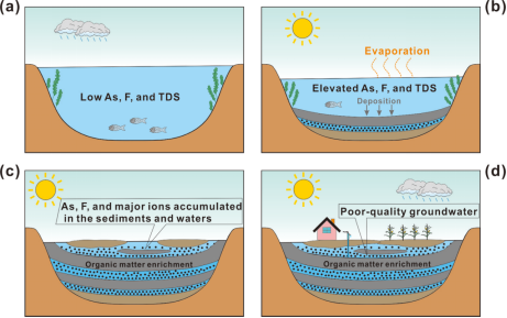 本文依据河套平原地表水体As和F含量的空间分布特征,结合样品Cl/Br值和氢氧同位素组成(δD和δ18O)等水化学指标,指出乌梁素海湖水中As和F的主要来源为黄河水,而蒸发作用引起的浓缩和解吸附是湖水中As和F富集的主要原因,并提出了古湖泊蒸发埋藏导致当地地下水As和F富集的新机制(图2)。这些认识对于揭示(古)黄河流域原生劣质地下水成因有重要意义。