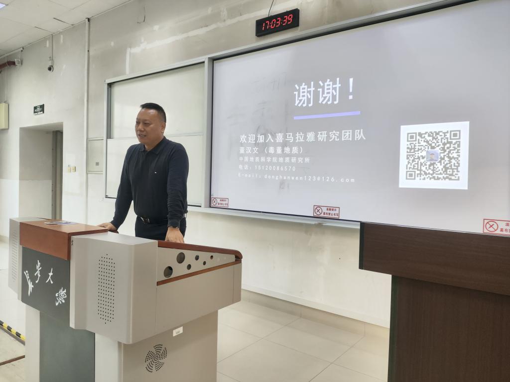 董汉文老师以“读懂地质”为题,围绕“什么是地质学、去哪里找石头、地球的秘密”三部分内容为大家做了一场生动的科普报告。在报告中,董老师展示了许多野外科考图片,介绍了许多地学研究内容,带领大家领略了地学魅力。他号召大家坚定专业自信、努力学习。
