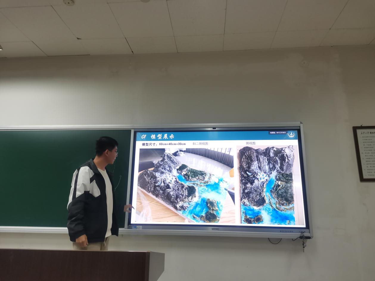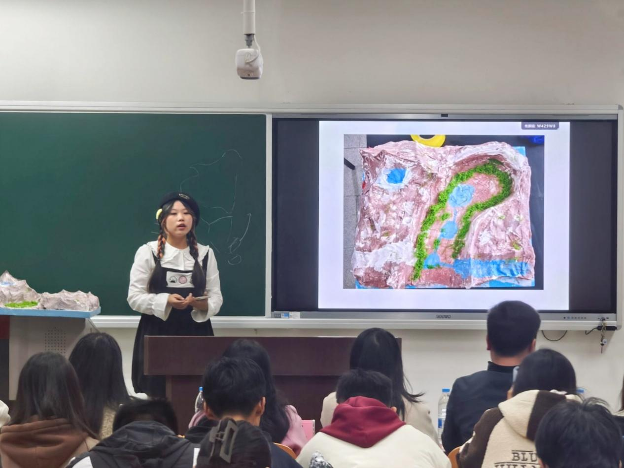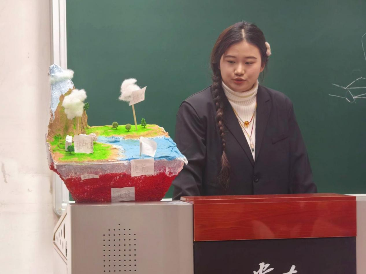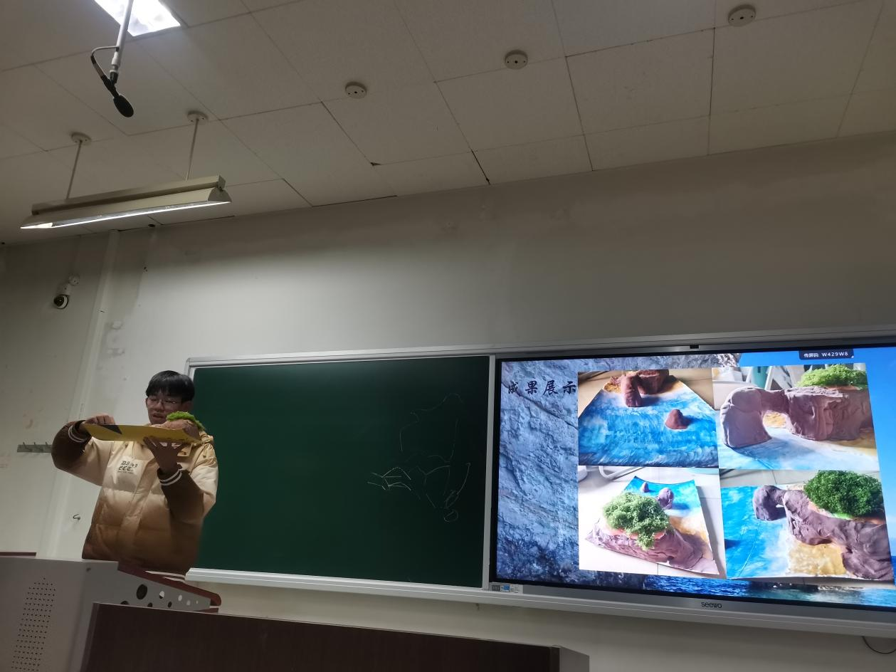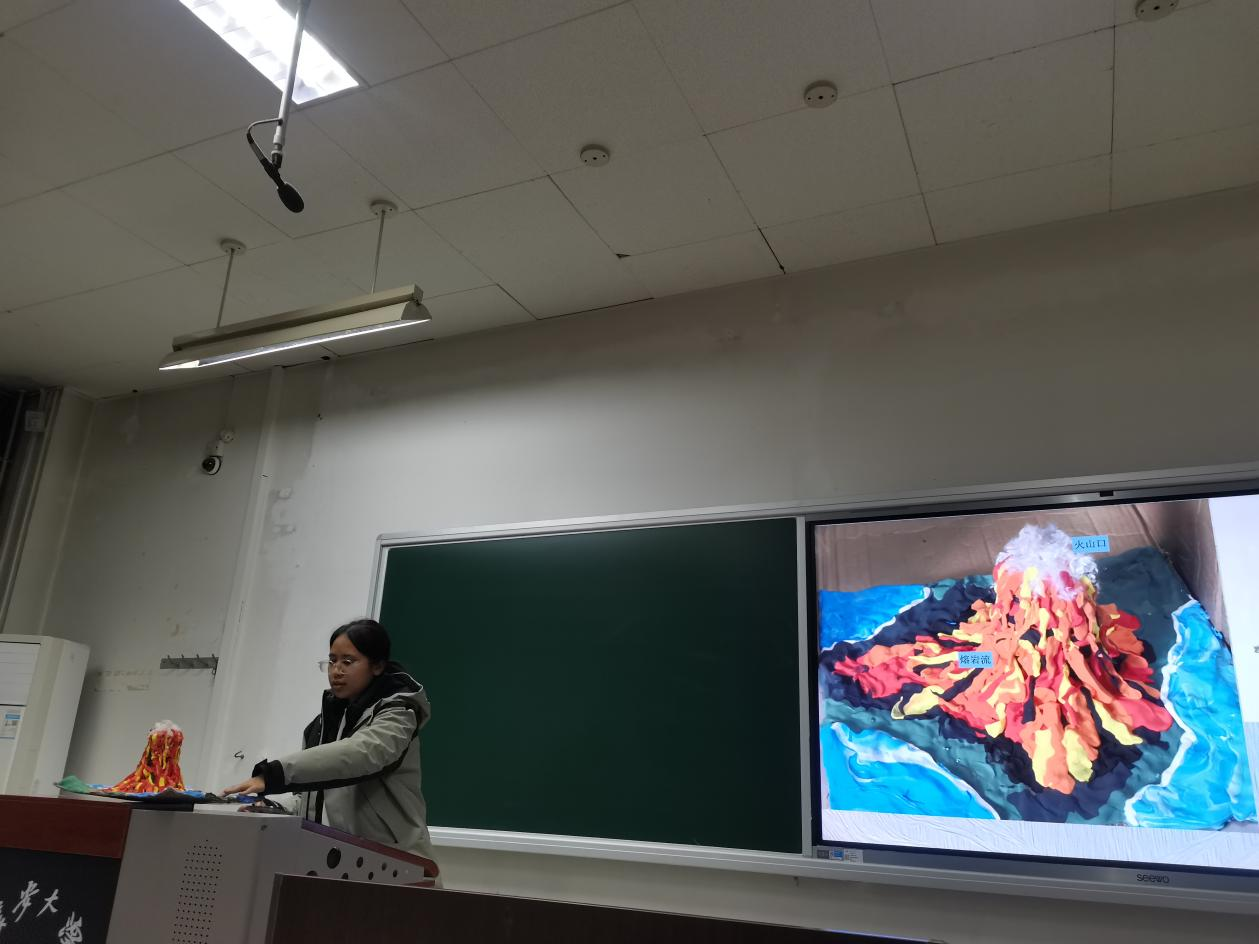 在主持人宣布比赛规则后,参赛队伍依次上台以PPT讲解的形式,重点介绍了模型制作原因、模型地质知识和收获与感悟等内容。参赛选手制作的地质模型有,海岸地貌、河流地貌、冰川地貌、地球圈层结构和喜马拉雅山隆升等,充分展现了参赛选手的专业能力及创造力;在讲解的同时,也为观众科普了大量地学知识。