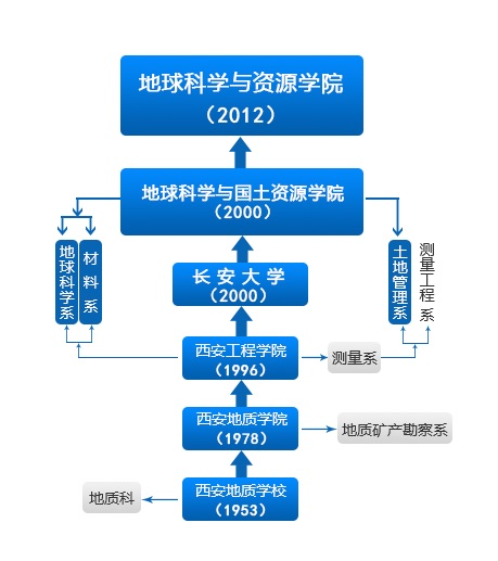 学院前身为成立于上世纪50年代初西安地质学校时期的地质科,1978年西安地质学院成立后,在原来西安地质学校地质科基础上成立了地质矿产勘查系。1980年代,经地质矿产部批准,原西安地质学院首任院长、著名地质学家张伯声院士组建了具有独立建制的地质构造研究所,张伯声院士亲自担任第一任所长。于1981年获得构造地质学硕士学位授权点、1984年获得岩石学(含沉积学)、矿床学和矿物学硕士学位授权点,1986年获得古生物学与地层学(含古人类学)硕士学位授权点。到上世纪90年代初期,建成了普通地质学、岩石学、矿相学、矿物学、矿床学、古生物与地史学、地球化学、石油地质学和找矿勘探地质学等教研室相应的教学实验室,从全国各地采集了大量珍贵地质标本,建成了普通地质学、矿物学、岩石学、矿产、古生物、构造地质学和沉积相等地质标本展室,成为我国五大地质矿产人才培养基地之一。 1996年原西安地质学院更名为西安工程学院,地质构造研究所并入地质矿产勘查系。为了适应教育体制改革和市场经济对人才的需求,在原来地质矿产勘查专业基础上,新开办旅游管理专业(地学旅游)、地理学专业、珠宝专业、城乡规划专业、无机非金属材料专业(矿物材料)等。根据教育部1998年颁布的《普通高等学校本科专业目录》,原地质矿产勘查专业变更为地质学专业(理科)和资源勘查工程专业(工科),1999年申请获批国土资源部成矿作用动力学开放研究实验室。2000年长安大学成立后进行院系和专业设置调整,在原西安工程学院地球科学系、国土系和材料系基础上组建了地球科学与国土草榴社区 ,开设地质学、资源勘查工程(含油气方向)、地理信息科学、无机非金属材料、矿物加工工程、旅游管理、土地资源管理、城乡规划、自然地理与资源环境等本科专业,2003年获构造地质学博士学位授权点、2005年获地质学一级学科博士学位授予权,2012年获批地质学博士后流动站,同年地质学专业成为陕西省名牌专业。2012年无机非金属材料本科专业从学院分离出去成立长安大学材料科学与工程学院,自然地理与资源环境本科专业停招,学院名称更名为草榴社区 。2016年,长安大学按照大类招生,将旅游管理专业划归长安大学经济管理学院,地理信息科学本科专业和部分教师划归长安大学地质工程与测绘学院,2017年新增设土地整治工程学本科专业。2019年,将土地整治工程学本科专业划归新组建的土地工程学院。